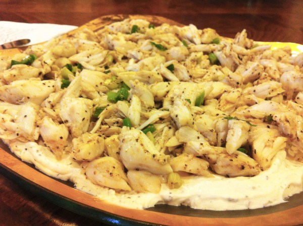 Spread the seasoned crabmeat in an even layer over the Boursin.  Sprinkle a few more green onions over the top of the crabmeat.
