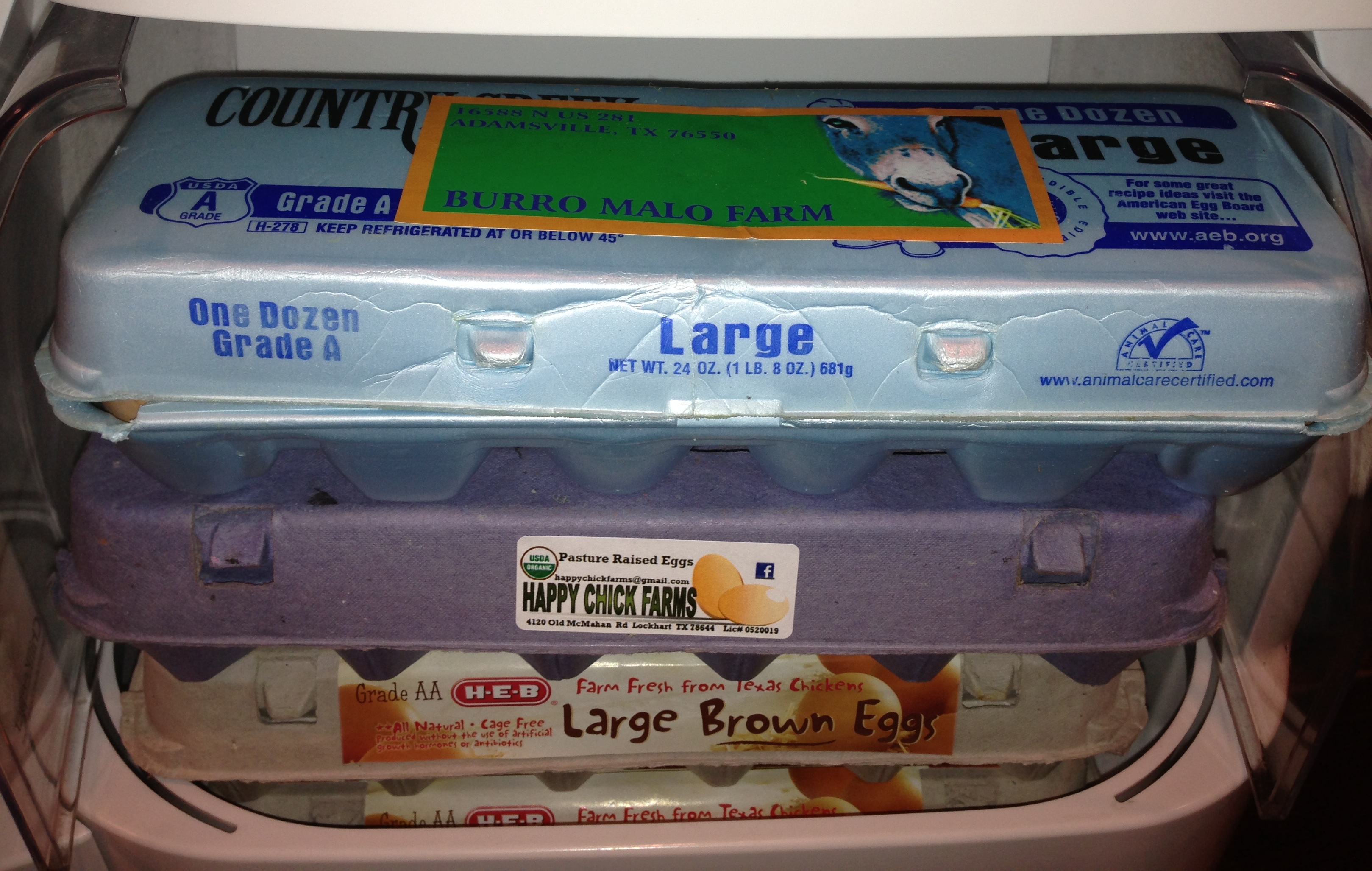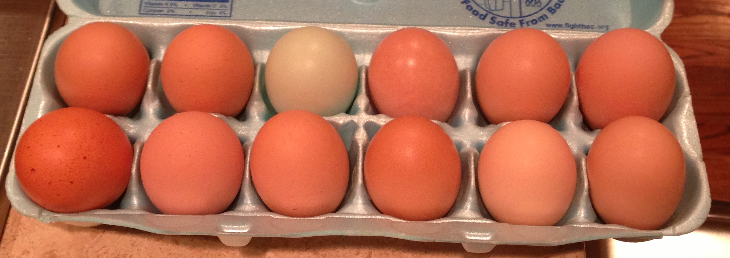 Here’s a pic of the eggs from Burro Malo Farm that I had to share — I don’t know why one is blue, but it sure is pretty! Does anyone know why eggs turn blue? Is it the chicken? Do they taste different?