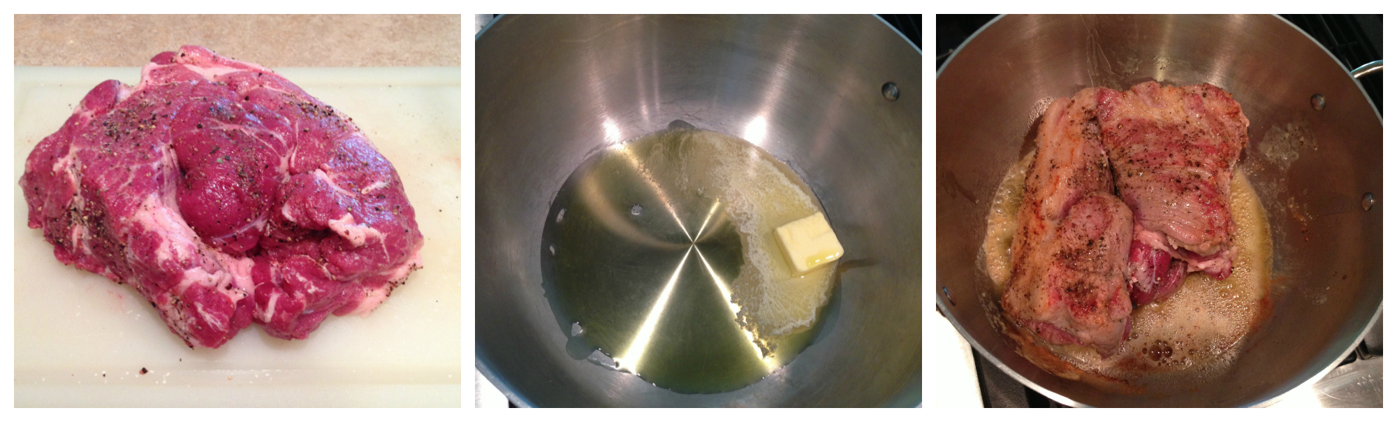 Salt and pepper the whole pork roast. Heat the butter and olive oil in a dutch oven over medium-high just until the butter melts, then add the pork roast and let it brown on each side – 2 to 3 minutes per side.