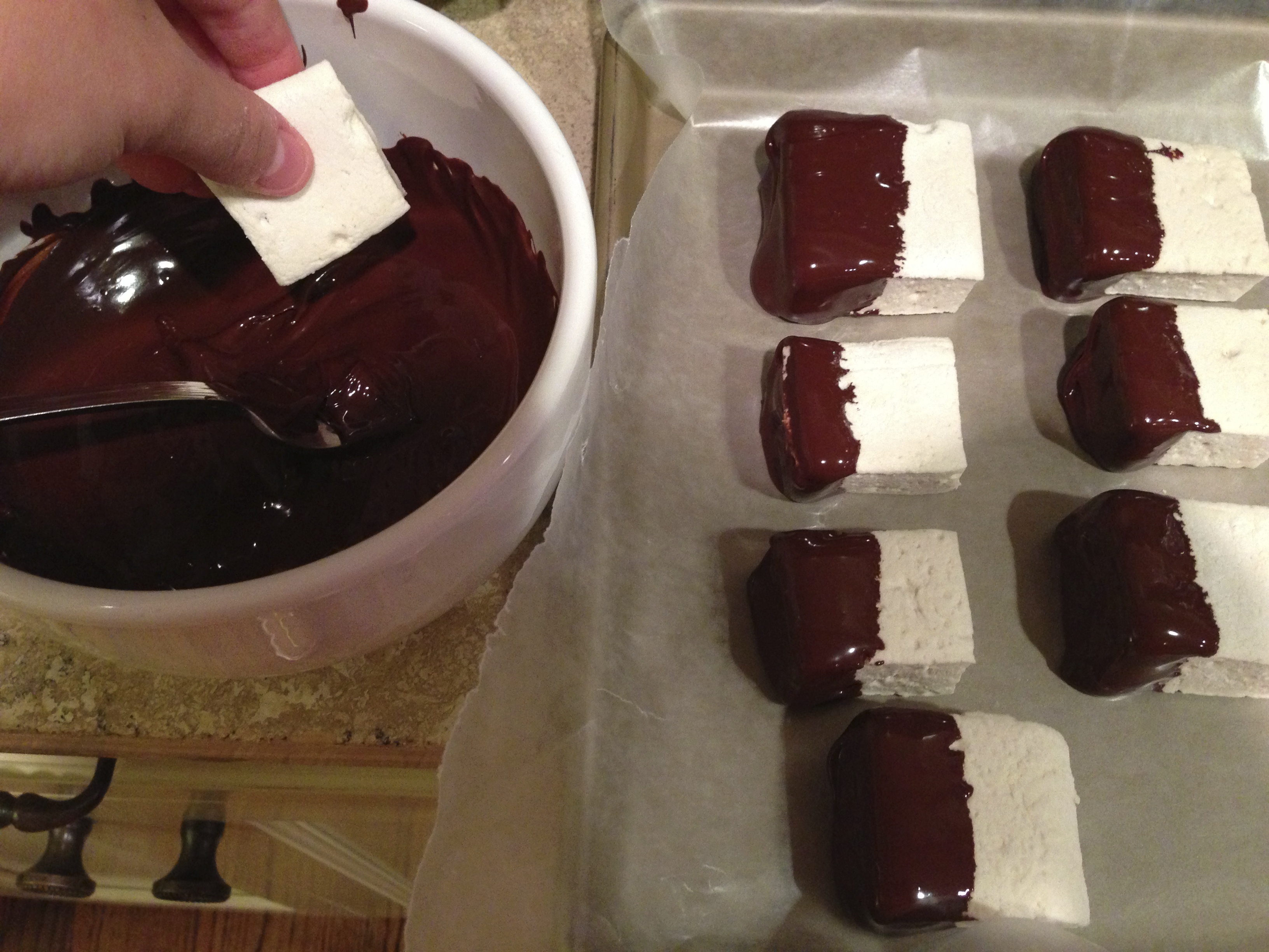 Melt a bag of good-quality dark chocolate chips in the microwave by heating for 20 second intervals and stirring well each time. Drag each marshmallow through the chocolate then lay them on wax paper on a cookie sheet to firm up.
