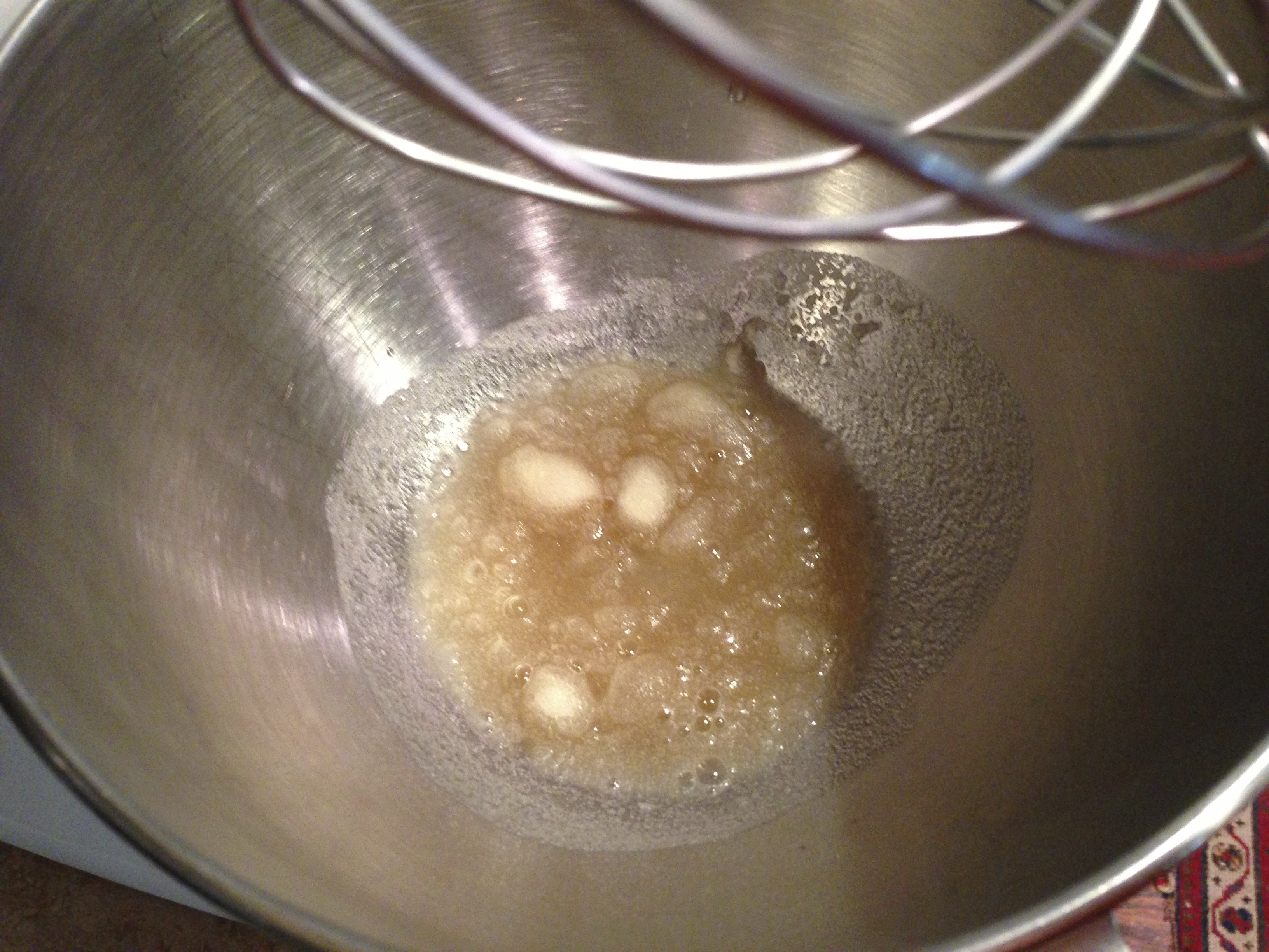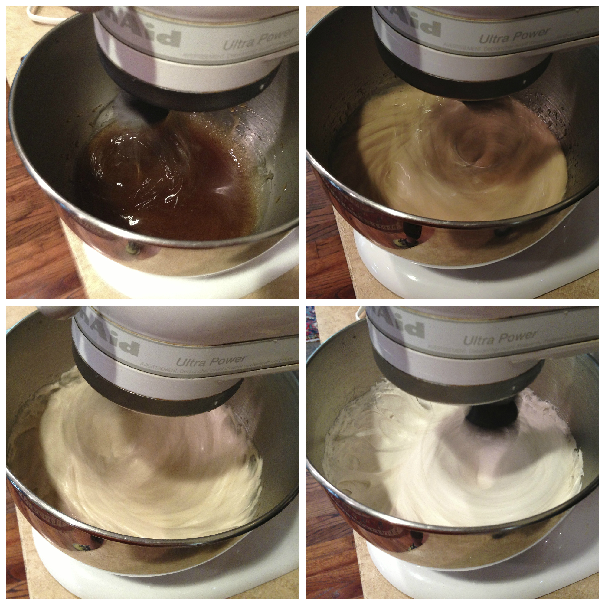 Once the sugar mixture reaches 240 degrees F, remove it from the heat and pour it in the mixer over the gelatin with the mixer on low speed. Crank up the speed to high, and it will turn from dark brown to a creamy white color over 6-8 minutes. When it is white and fluffy, add the beaten egg whites and vanilla to the sugar/gelatin mixture and beat again until just combined.