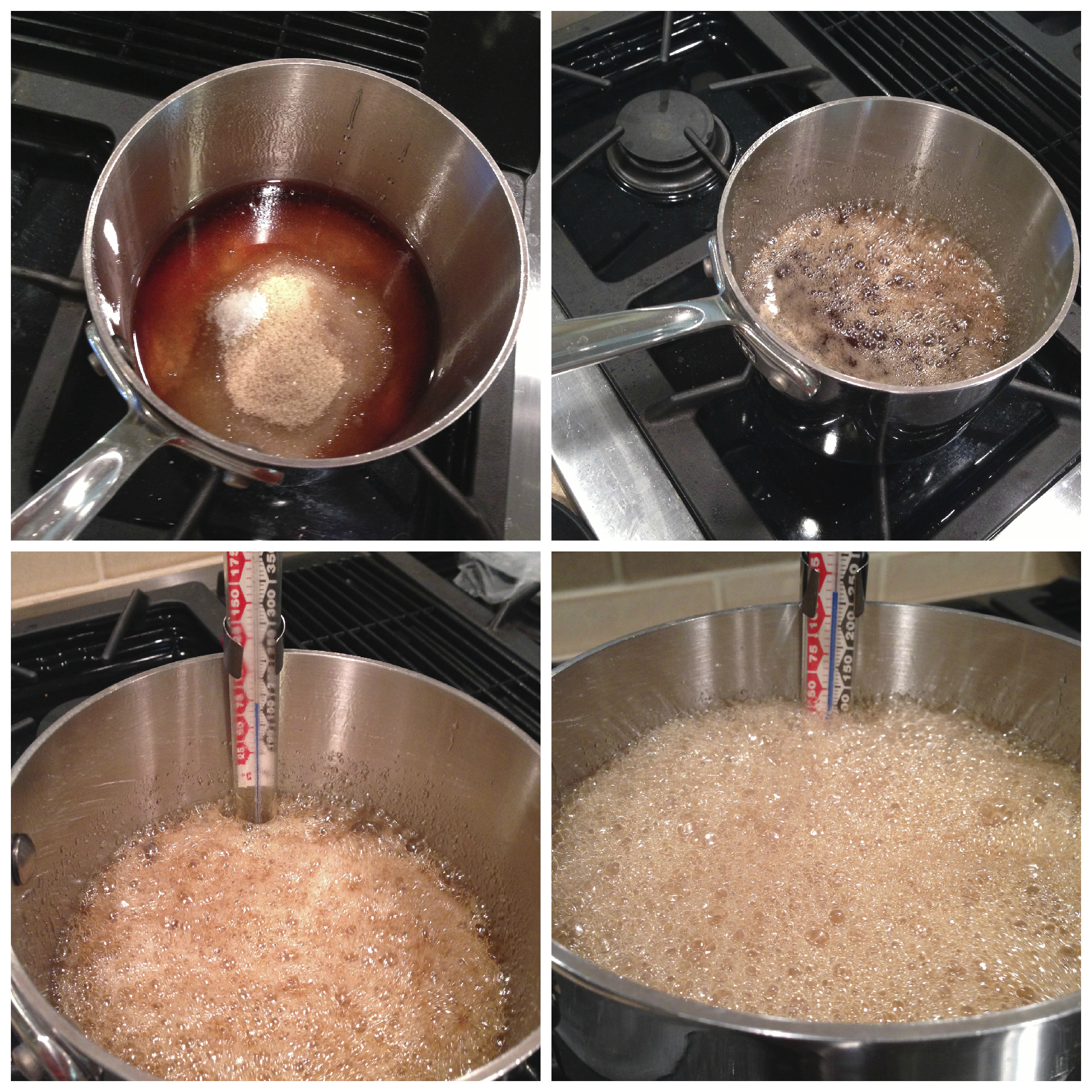 So, I started looking up recipes and testing. Almost every single recipe called for high fructose corn syrup, which bummed me out because I never use it (in fact, I didn’t even have a bottle in my pantry and had to go buy some). But corn syrup is to natural sweeteners what safflower oil is to olive oil — it has a higher smoke point and doesn’t break down at high heats. Using just honey, maple syrup and agave nectar would cause crystallization in the marshmallows.
