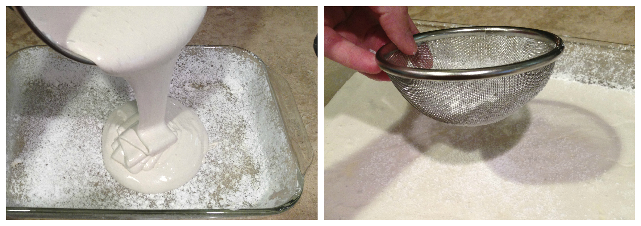 Pour the marshmallow batter into the coated 9″ x 13″ pan. If it does not all come out, which it probably won’t, spray a spatula with Pam and scrape the rest out. Then spray that spatula again and use it to smooth out the top. Sprinkle powdered sugar on them and set them aside for 3-5 hours to become firm.