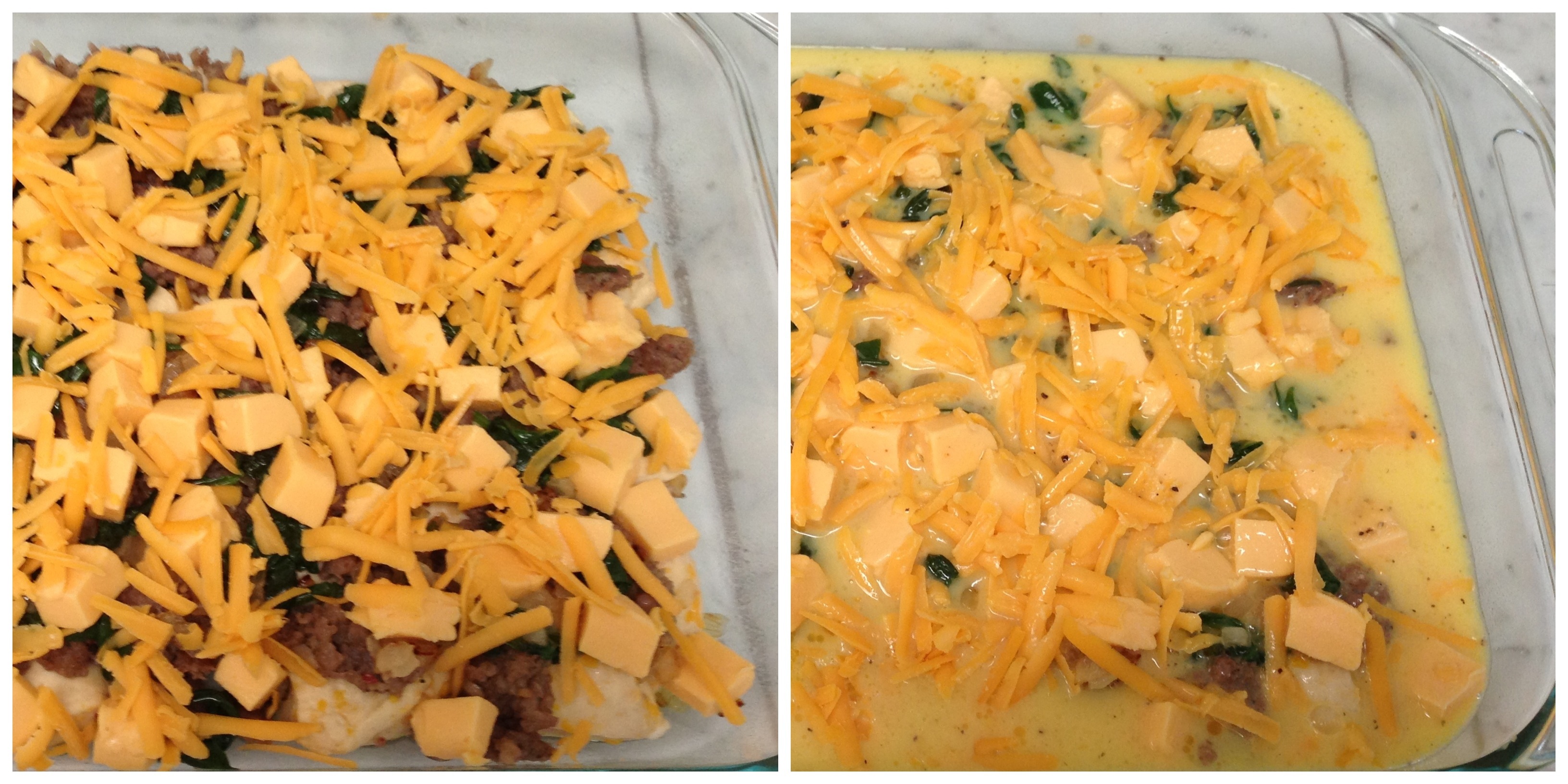 Top the biscuits with the onions, spinach, sausage, Velveeta and cheddar. Whisk the eggs, milk, garlic powder, mustard powder, salt and pepper. Pour over the biscuits and other ingredients.