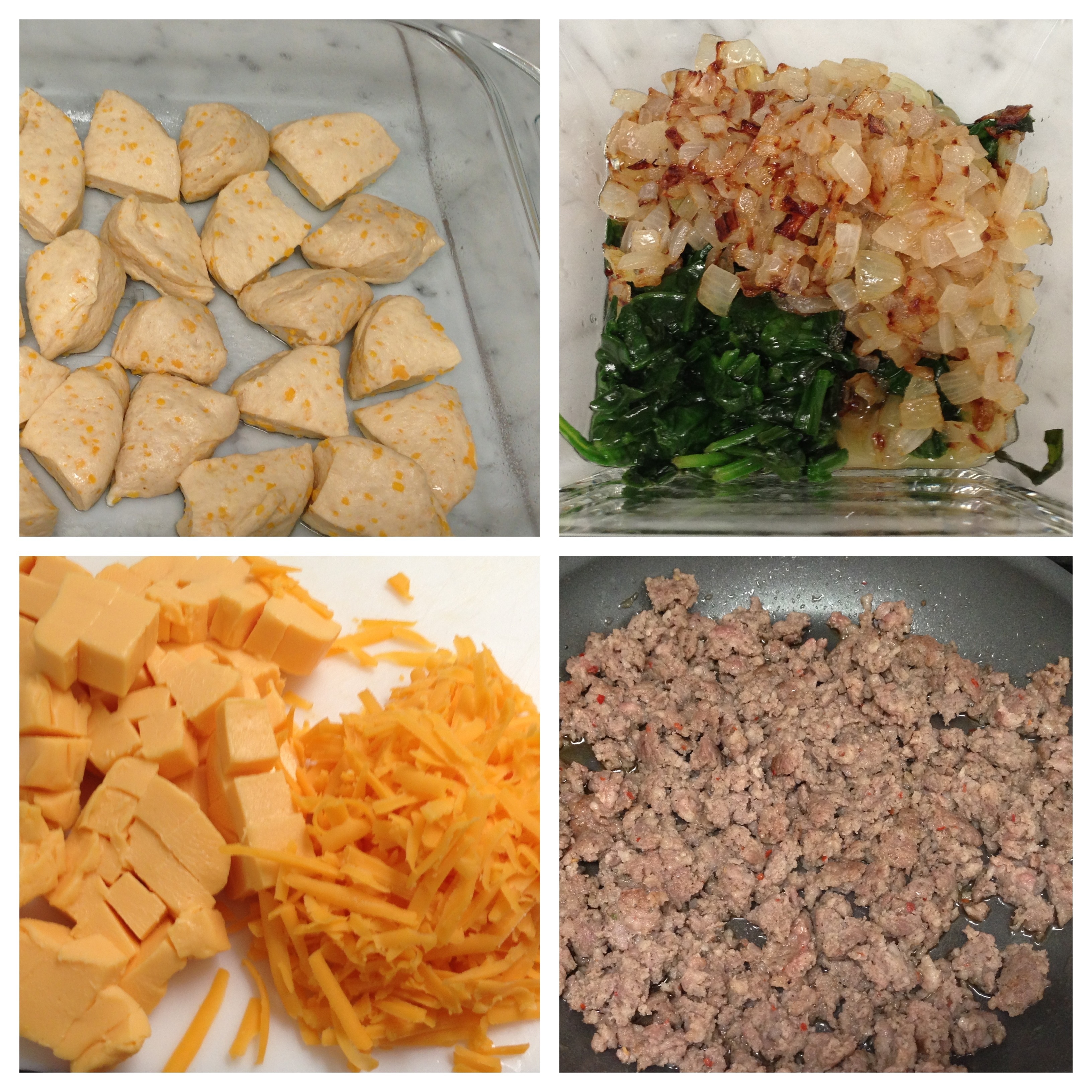 Quarter biscuits and place in a greased 9″x13″ dish. In a skillet, dice and sauté the onions until they are caramelized. Remove from pan and add spinach. Sauté until wilted. Remove the spinach from the pan and add the sausage. Use a spatula to break up the sausage and cook until it is completely browned.