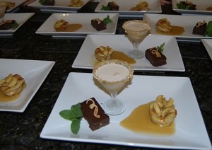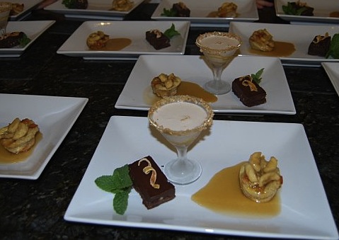 On the left is a dark chocolate and orange tart, in the middle is a crème brûlèe martini, and on the right is a bananas foster bread pudding.